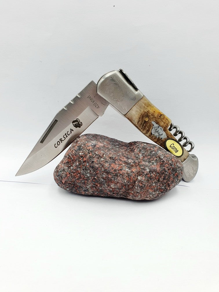 Couteau acier. Manche en corne avec une corse incrustée et un tire-bouchon. On peut voir un sanglier sur la corse. Longueur de la lame 9 cm. Livré avec son étui.
