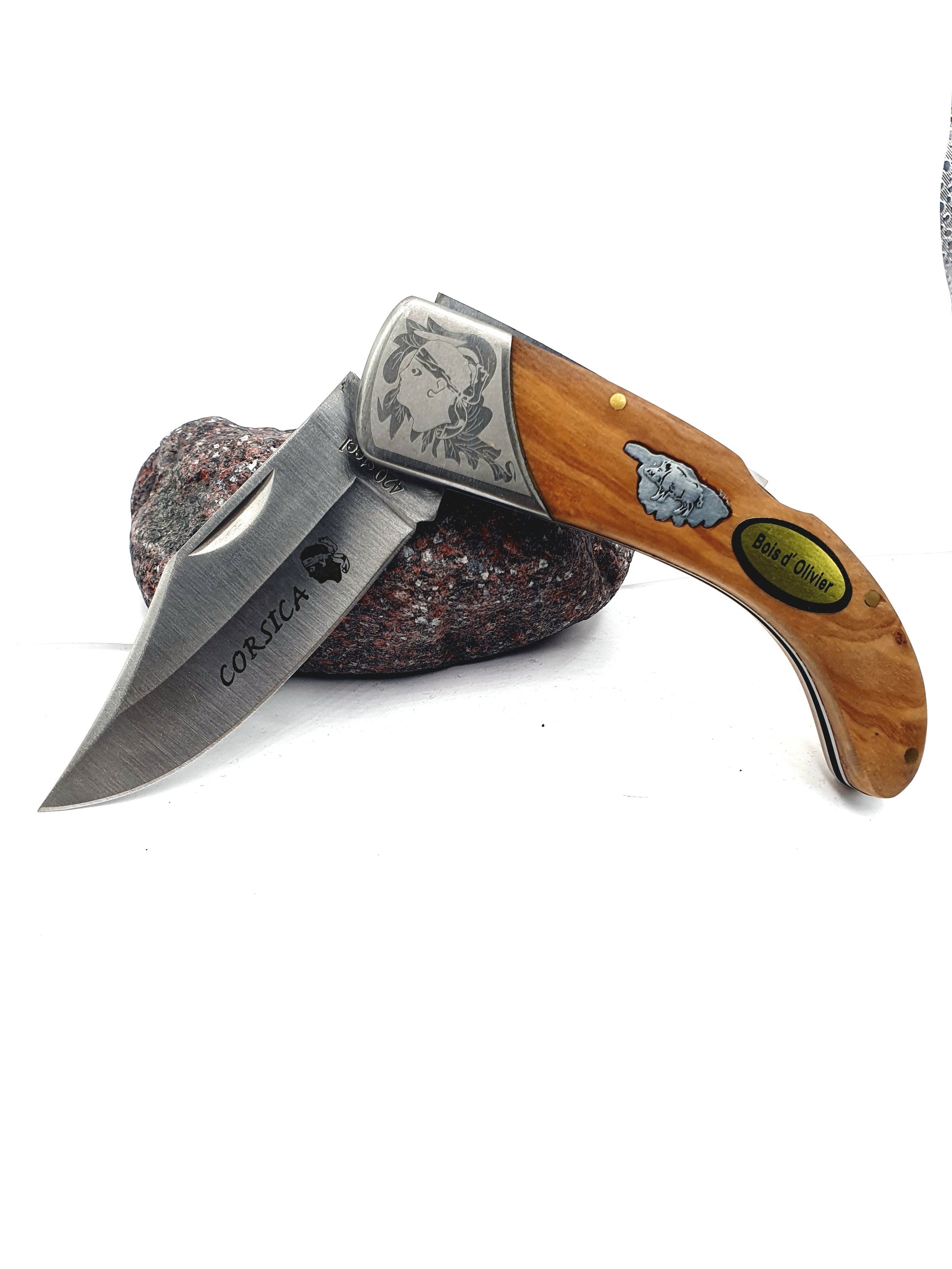 Couteau en bois d'olivier. Longueur de la lame 8.5 cm. Couteau avec cran de sûreté. corsica-souvenirs.com.