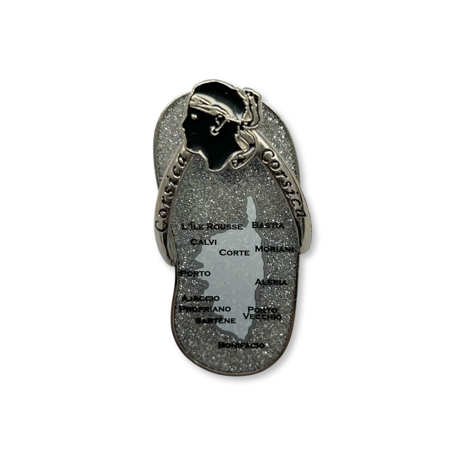 Découvrez le magnet en forme de tong corse à paillettes argentées, un accessoire élégant et pétillant qui célèbre la Corse avec style. Parfait pour décorer votre frigo, bureau ou tout autre espace, ce magnet allie créativité et authenticité. Sa finition scintillante à paillettes argentées apporte une touche moderne et raffinée, idéale pour un souvenir ou un cadeau original.