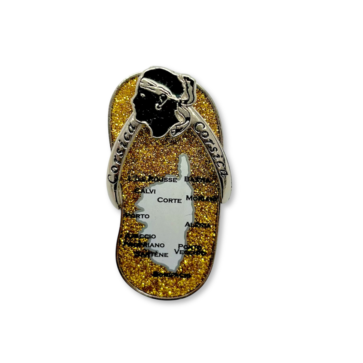 Découvrez le magnet en forme de tongue corse à paillettes dorées, un accessoire chic et lumineux qui célèbre l’esprit de la Corse avec originalité. Parfait pour décorer votre frigo ou votre bureau, ce magnet allie créativité et authenticité. Sa finition brillante à paillettes dorées apporte une touche festive et élégante, idéale pour offrir en souvenir ou compléter votre collection d’objets corses uniques.