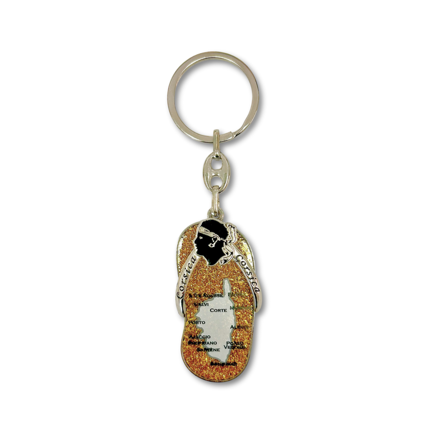 Ce porte-clés Corse à paillettes dorées, en forme de tong, est l’accessoire idéal pour rappeler la chaleur et la lumière de l’île de beauté. À la fois chic et amusant, il fera briller vos clés ou sacs toute l’année.